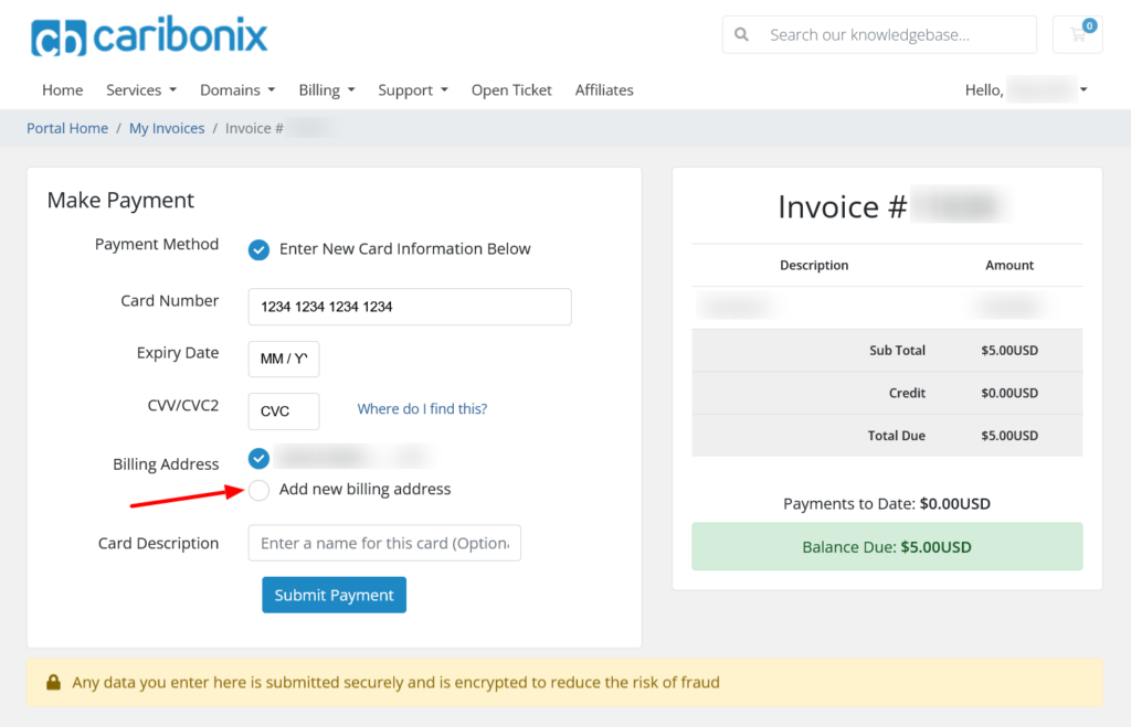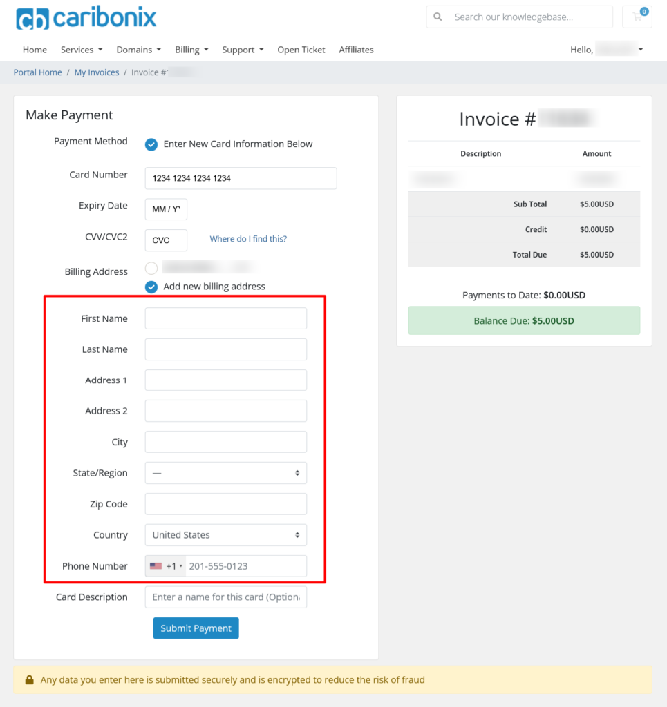 Your billing address will automatically be filled using your Caribonix account details.